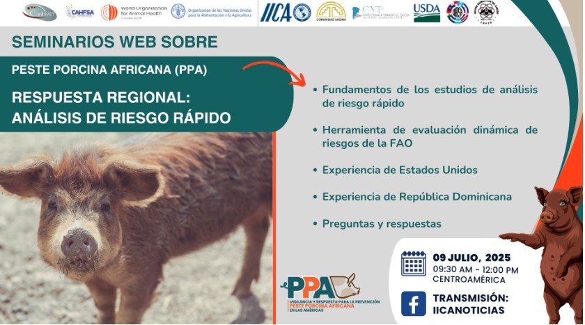 En seguimiento al ciclo de seminarios web que se realizan en el marco del Programa Global – Enfermedades Animales Transfronterizas (GF-TADs – por sus siglas en inglés) y a través de su grupo de trabajo interagencial de preparación en prevención y respuesta ante la Peste Porcina Africana (PPA) para América Latina y el Caribe, del cual el CVP es integrante, el próximo miércoles 9 de julio de 2025, se realizará el Seminario «Respuesta Regional: Análisis de riesgo rápido«.